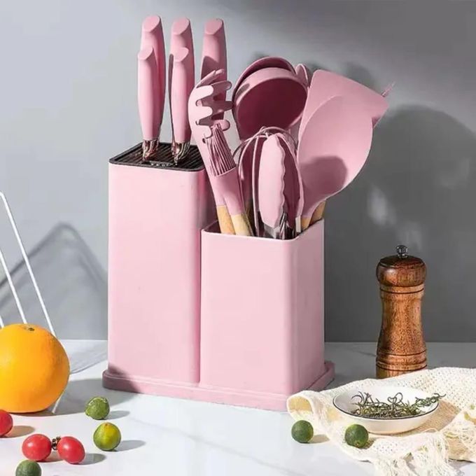Complete 19-piece set: Includes knives, forks, spoons, silicone utensils, and a chopping board.