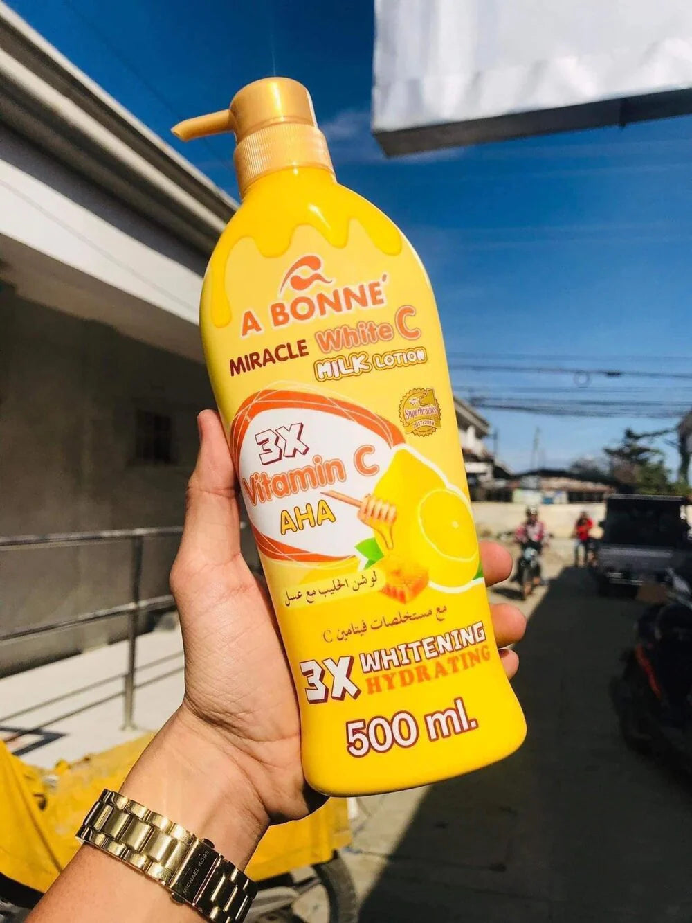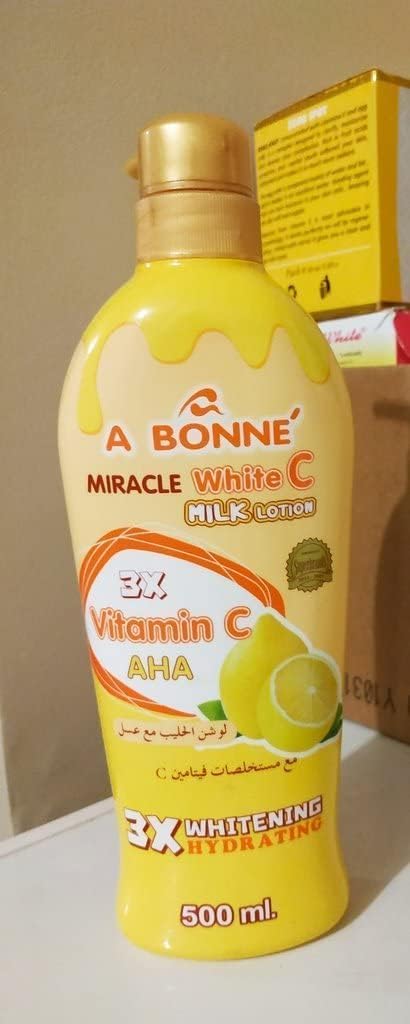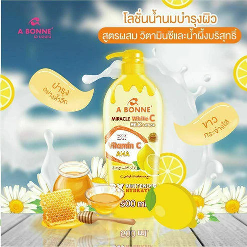 Description: A Bonne Miracle White C Milk Lotion is a rich, nourishing body lotion designed to brighten and hydrate your skin, leaving it feeling soft, smooth, and radiant. Infused with the power of Vitamin C and Milk Extract, this lotion helps lighten dark spots, hyperpigmentation, and uneven skin tone while deeply moisturizing the skin. The combination of these ingredients promotes a more even complexion, revealing glowing and youthful-looking skin. Perfect for daily use, this lightweight lotion absorbs quickly, providing long-lasting hydration without any greasy residue.