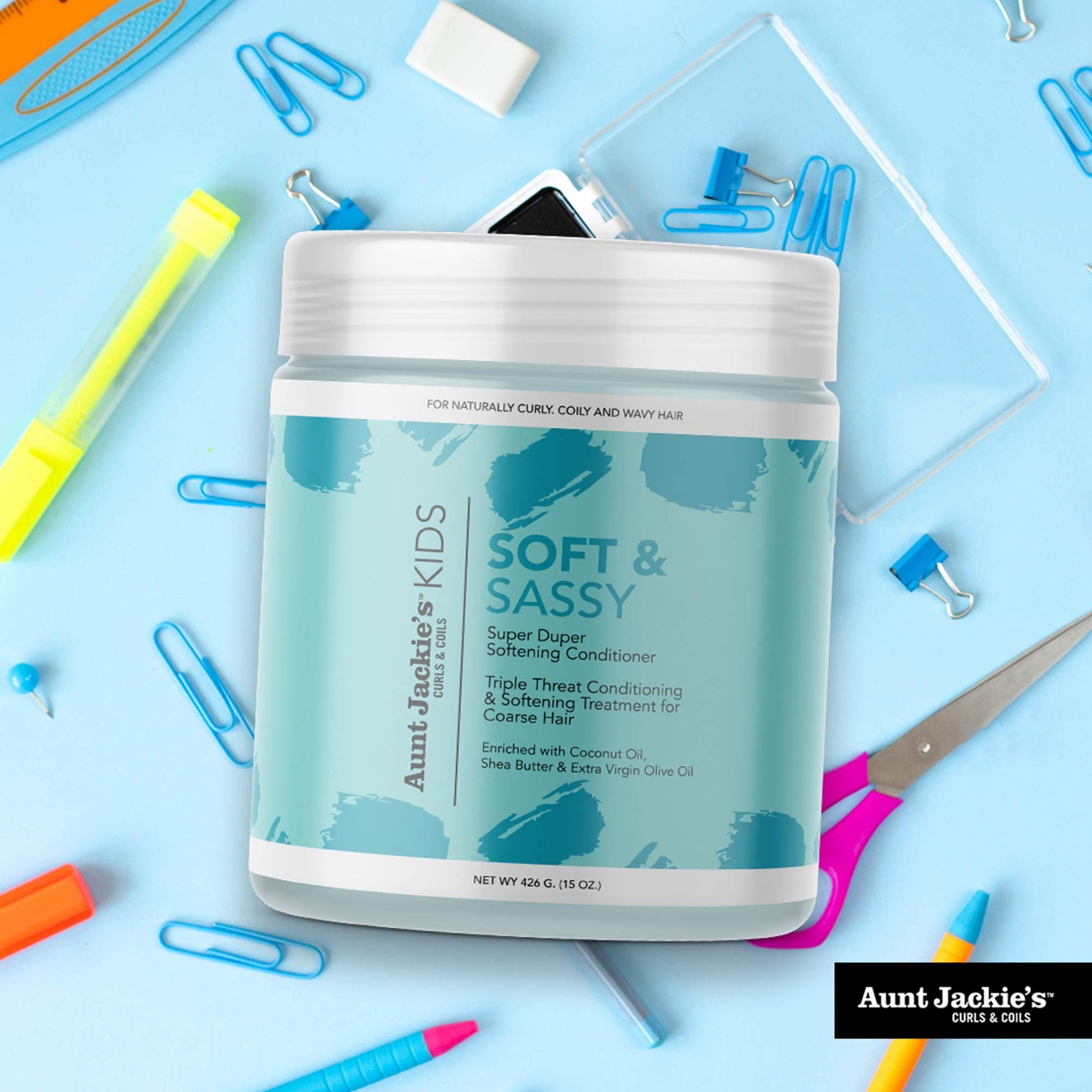 Aunt Jackie’s Girls Soft & Sassy Softening Conditioner is specially crafted to provide intense moisture and softness to young, textured hair. This rich, creamy formula is enriched with coconut oil, shea butter, and extra virgin olive oil, making it ideal for taming frizz, loosening tangles, and keeping curls, coils, and waves healthy and manageable.