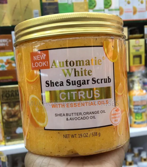 Automatie White Shea Sugar Scrub is a luxurious exfoliating product designed to gently remove dead skin cells, leaving your skin feeling smooth, soft, and rejuvenated. The scrub combines the natural exfoliating power of sugar with the moisturizing benefits of shea butter, making it ideal for nourishing and hydrating the skin. The fine sugar particles effectively slough off impurities while promoting circulation, while the shea butter deeply nourishes and helps to retain the skin’s natural moisture.
