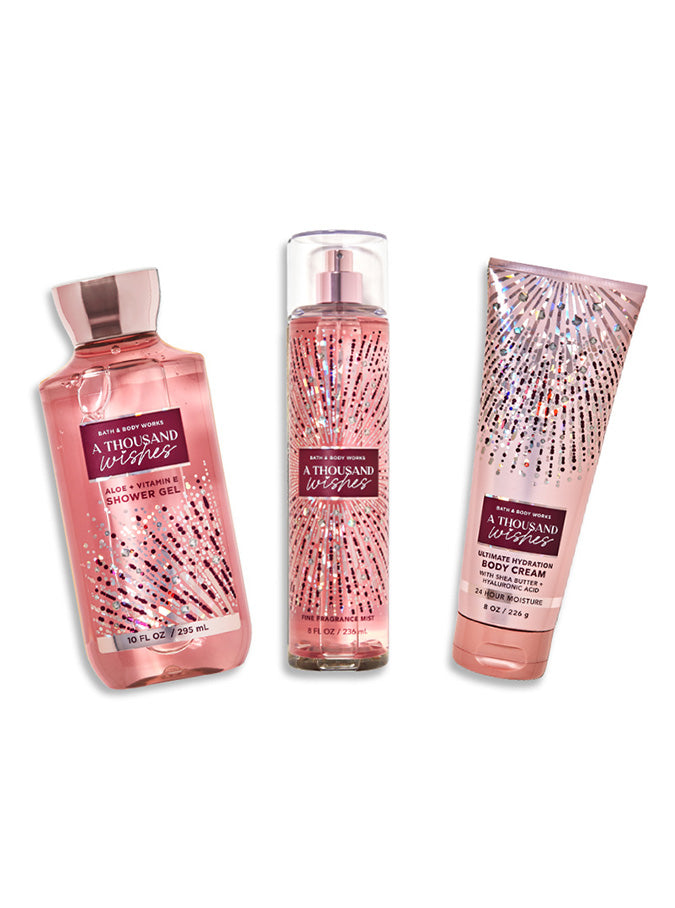 The Bath & Body Works A Thousand Wishes Set is a luxurious collection of fragrance and body care products designed to pamper and refresh your skin while enveloping you in a radiant, festive scent. Featuring a blend of pink Prosecco, crystal peonies, gilded amber, and amaretto cream, this set offers a sweet, floral fragrance with a warm, sophisticated undertone. The set typically includes shower gel, body lotion, fine fragrance mist, and body cream—each formulated to hydrate, soften, and leave your skin delicately scented. Perfect for gifting or indulging in self-care, this set turns your daily routine into a truly special experience.