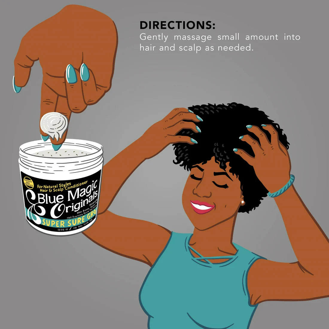 Trust the original for proven results. Blue Magic Original Super Sure Gro is a classic hair and scalp conditioner formulated to promote healthy hair growth while strengthening and protecting each strand. Infused with a blend of nourishing oils and herbal extracts, it deeply conditions the scalp and hair, helping to prevent breakage, dryness, and split ends.