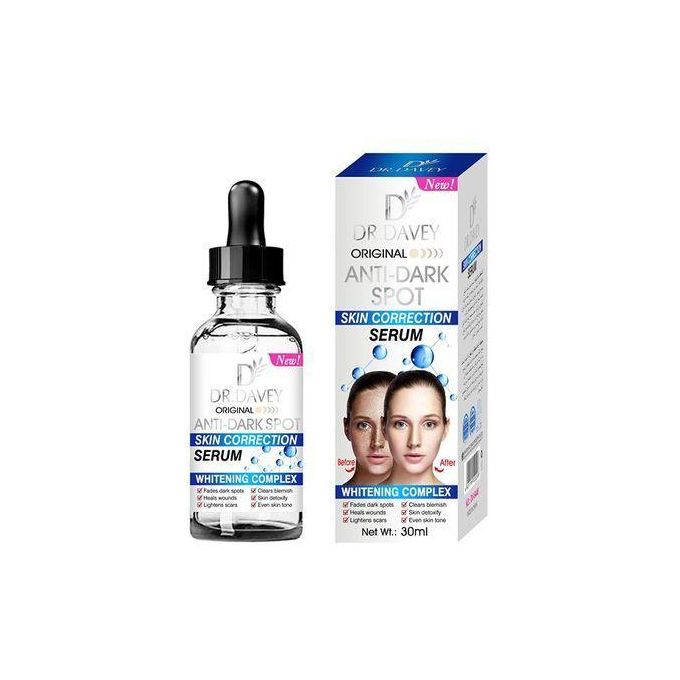 Description: Dr. Davey Anti-Dark Spot Skin Correction Serum is a potent and targeted treatment designed to visibly reduce dark spots, hyperpigmentation, and uneven skin tone. Formulated with powerful ingredients, this serum helps to brighten the skin, fade stubborn dark spots, and promote a clearer, more even complexion. With regular use, it works to enhance skin radiance and deliver a more youthful, flawless appearance. Lightweight and fast-absorbing, it’s perfect for addressing dark spots, sun damage, acne scars, and other skin discolorations.