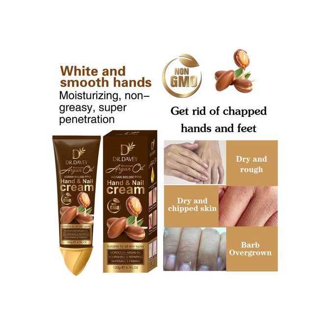 Description: Dr. Davey Argan Oil Hand & Nail Cream is a rich, nourishing formula designed to hydrate, repair, and protect your hands and nails. Infused with the luxurious benefits of Argan Oil, this hand cream deeply moisturizes and helps to restore the skin’s softness, while also strengthening and conditioning your nails and cuticles. The lightweight, non-greasy texture absorbs quickly, providing long-lasting hydration and a smooth, supple feel, making it ideal for daily use, especially for dry or cracked hands.