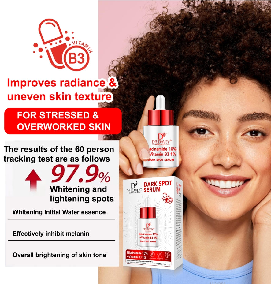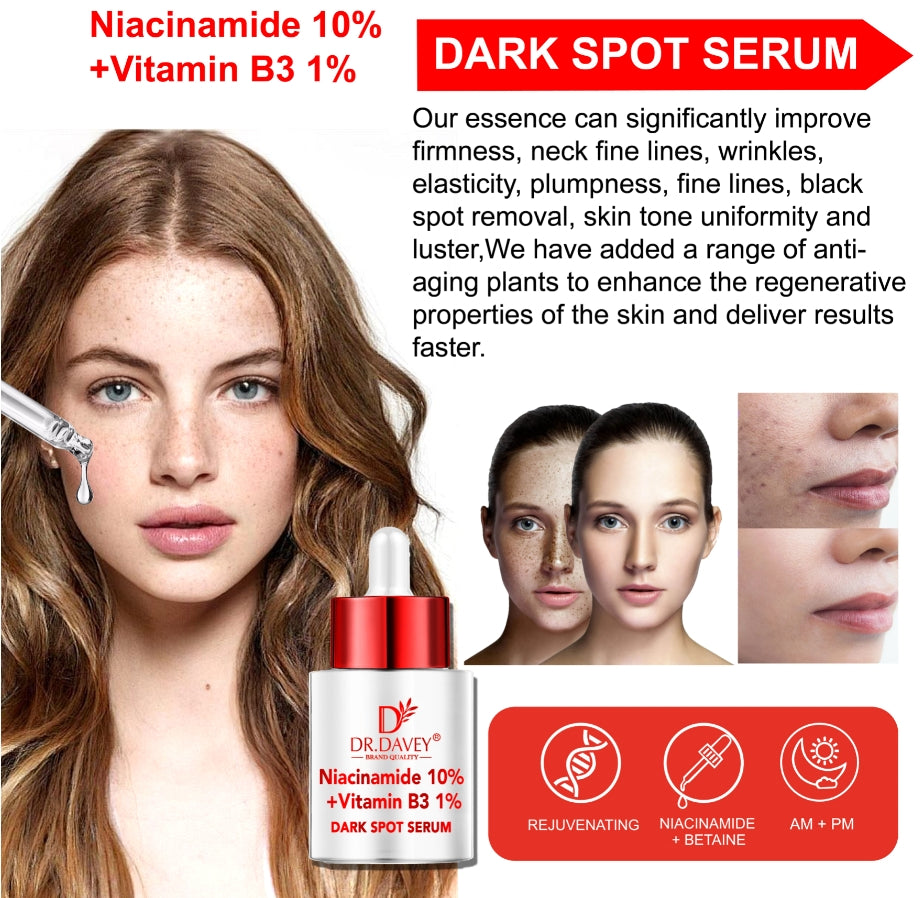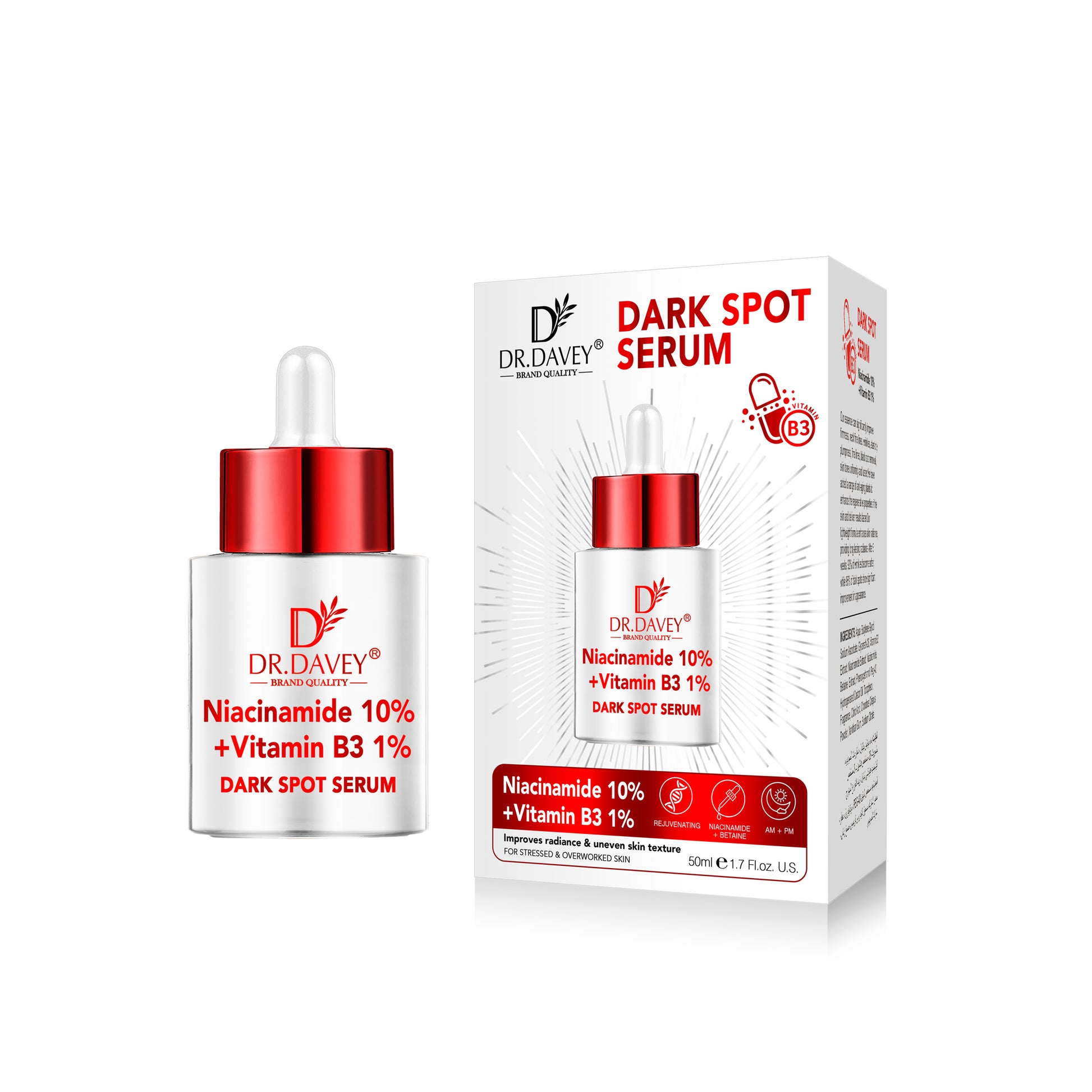 Say goodbye to stubborn dark spots and uneven skin tone with Dr. Davey Dark Spot Serum – a powerful, fast-acting formula designed to visibly fade hyperpigmentation, age spots, acne scars, and sun damage. Enriched with brightening botanicals, Vitamin C, and Niacinamide, this serum penetrates deep into the skin to lighten discoloration while promoting a smoother, more radiant complexion.