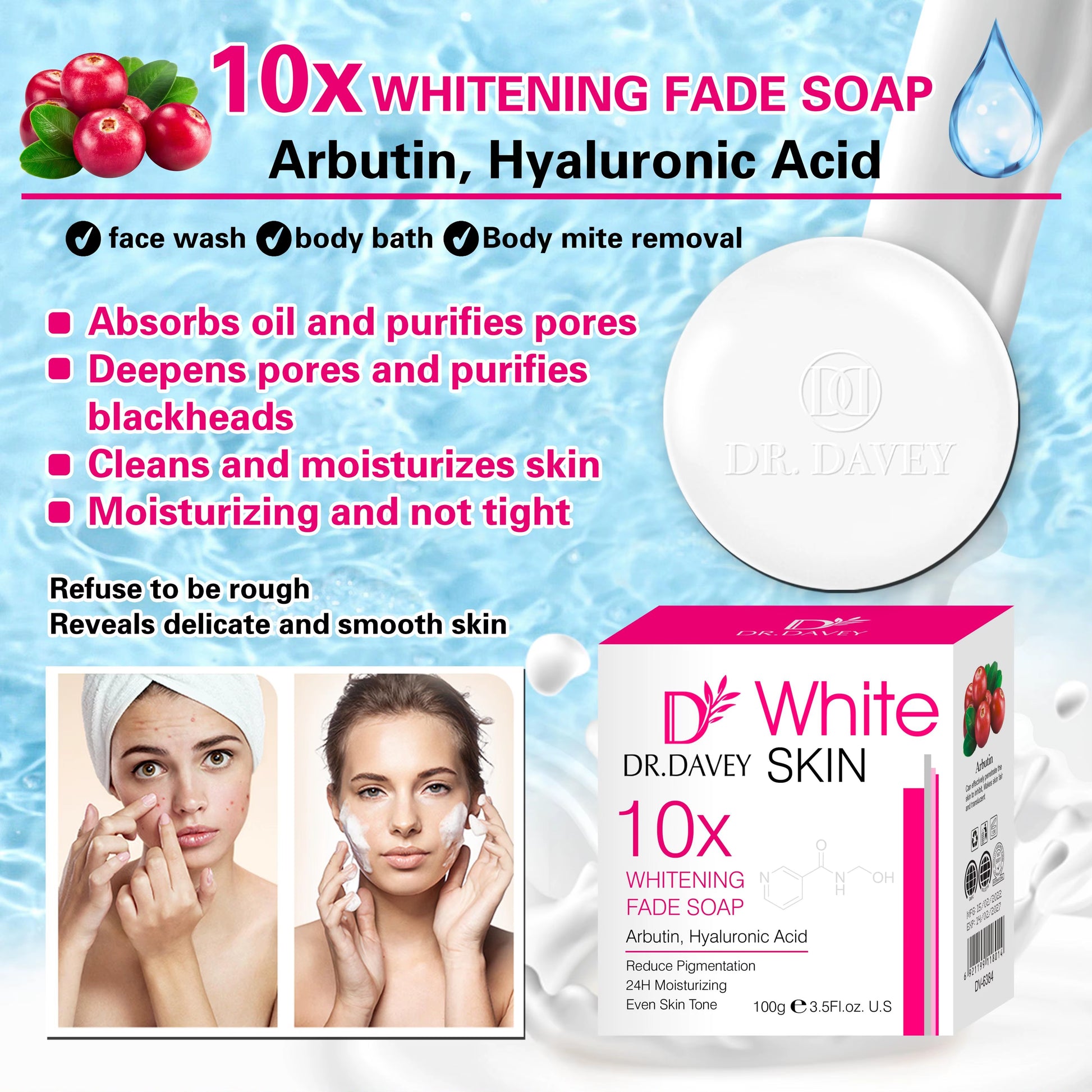Achieve visibly brighter and clearer skin with Dr. Davey White Skin 10x Fade Soap. This intensive whitening formula is designed to fade stubborn dark spots, acne marks, and uneven skin tone up to 10 times faster, giving you a smooth, radiant complexion with consistent use.