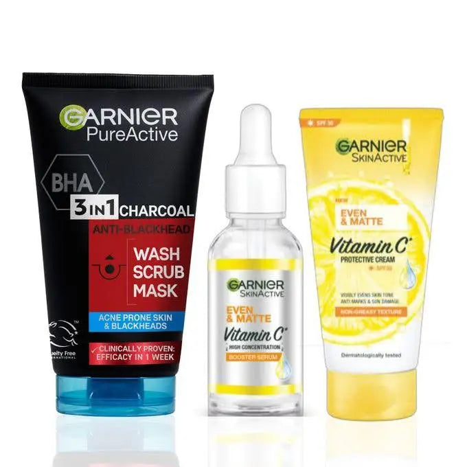 The Garnier Bye Acne & Dark Spots Kit is a complete 3-piece skincare set specifically designed to tackle acne and dark spots. This targeted skincare regimen works to reduce breakouts, clear blemishes, and fade dark spots caused by acne, leaving your skin clearer, smoother, and more even-toned. The kit contains three effective products that work in harmony to provide both immediate relief from acne and long-term brightening benefits for a healthier, glowing complexion.