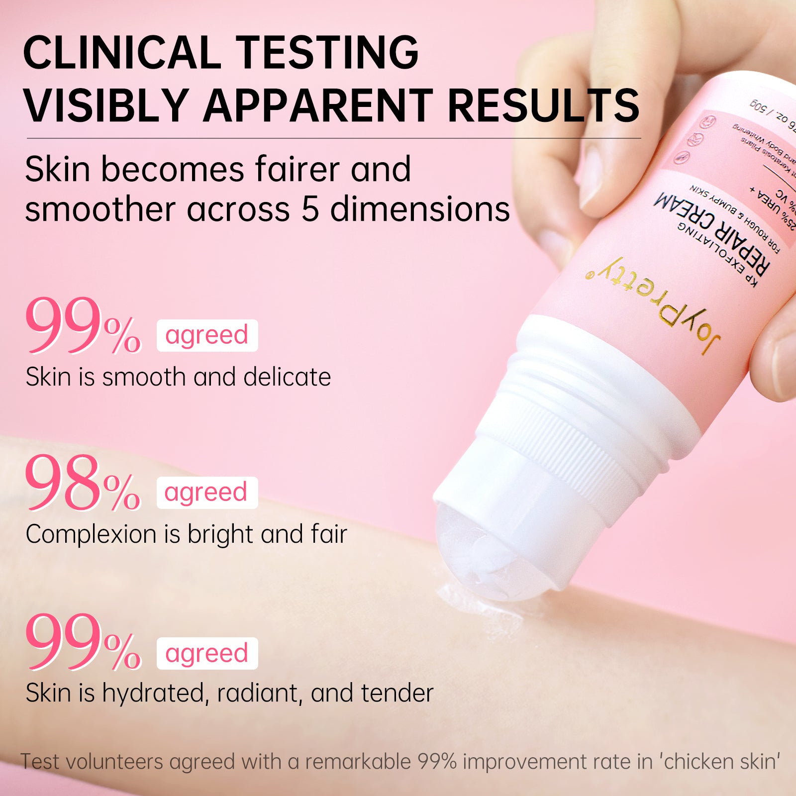 JoyPretty Exfoliating Repair Cream delivers strong exfoliation with urea + brightening vitamins in a hydrating, easy-to-use formula—perfect for smoothing keratosis pilaris, rough patches, cracked skin, and dull texture. Dermatologist-directed and suitable for facial or full-body application, it’s a versatile solution for achieving softer, smoother, more radiant skin.