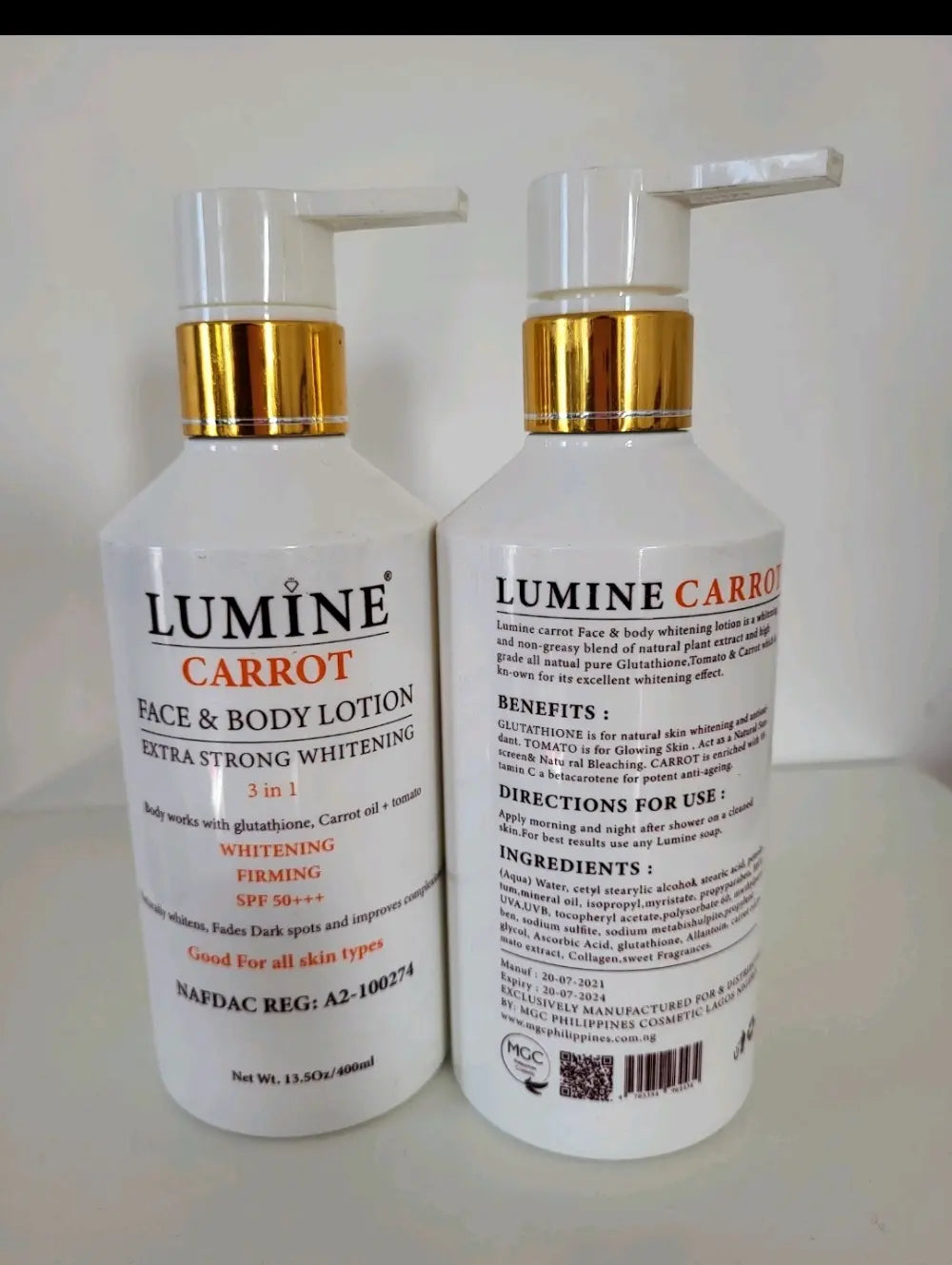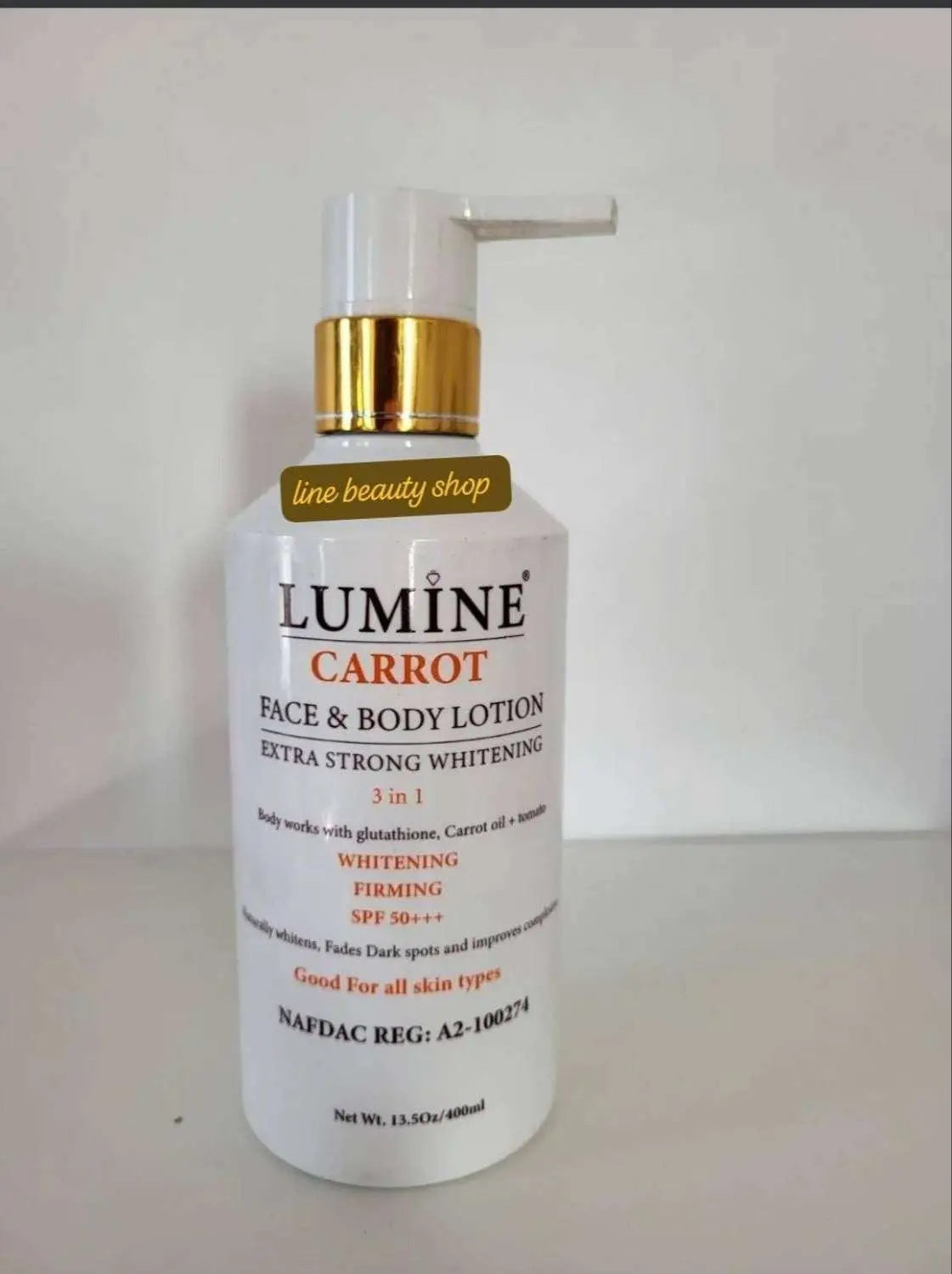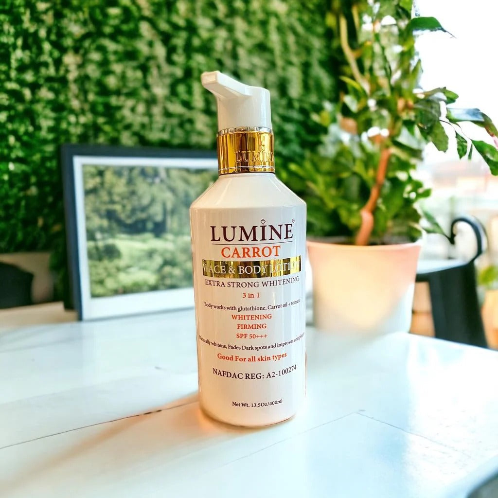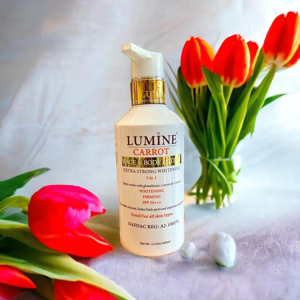 Lumine Carrot Face & Body Lotion (400ml) is a nourishing and revitalizing skincare product designed to hydrate, brighten, and even out the complexion of both the face and body. Enriched with the natural goodness of carrot extract, this lotion is packed with vitamins and antioxidants that help to enhance skin radiance, reduce the appearance of dark spots, and provide long-lasting moisture. Its lightweight, fast-absorbing formula makes it ideal for daily use, leaving your skin feeling soft, smooth, and glowing.