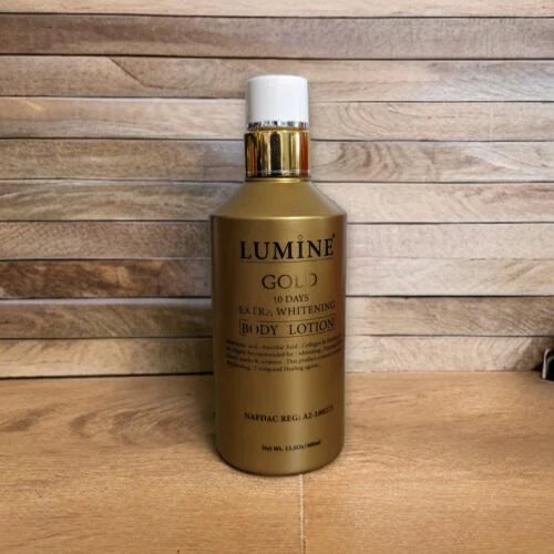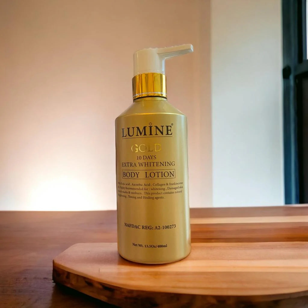 Lumine Gold Extra Whitening Body Lotion (400ml) is a luxurious skincare product designed to deeply nourish, hydrate, and lighten the skin. Infused with a blend of powerful ingredients, this body lotion helps to reduce the appearance of dark spots, uneven skin tone, and hyperpigmentation, leaving your skin visibly brighter, smoother, and glowing. The rich, non-greasy formula absorbs quickly to provide long-lasting moisture while promoting a radiant, youthful complexion.