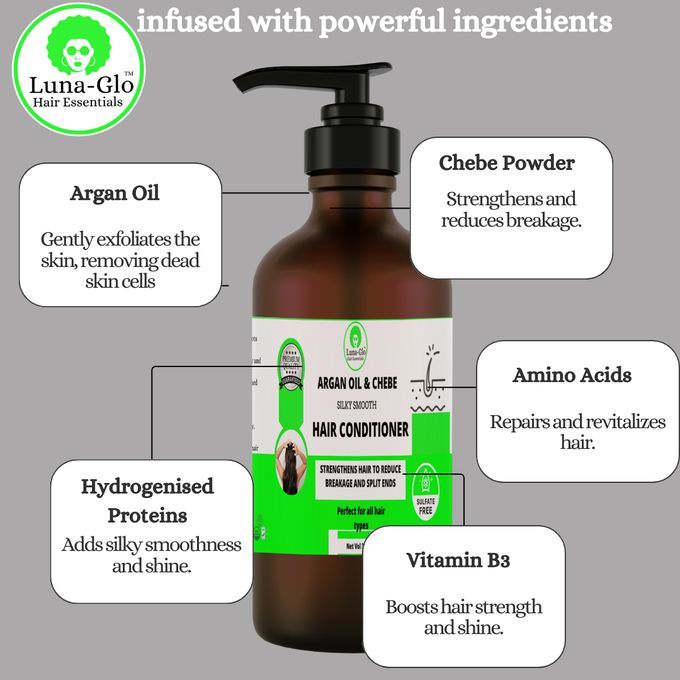 Give your hair the nourishment it deserves with Luna-Glo Argan Oil & Chebe Silk Smooth Conditioner — for hair that feels as good as it looks.