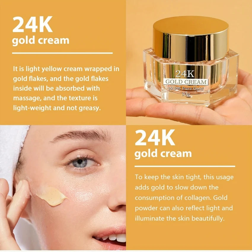 24K Gold Infusion: Enriched with pure 24K gold, known for its anti-aging and skin-brightening properties, this cream helps promote a youthful, radiant complexion.