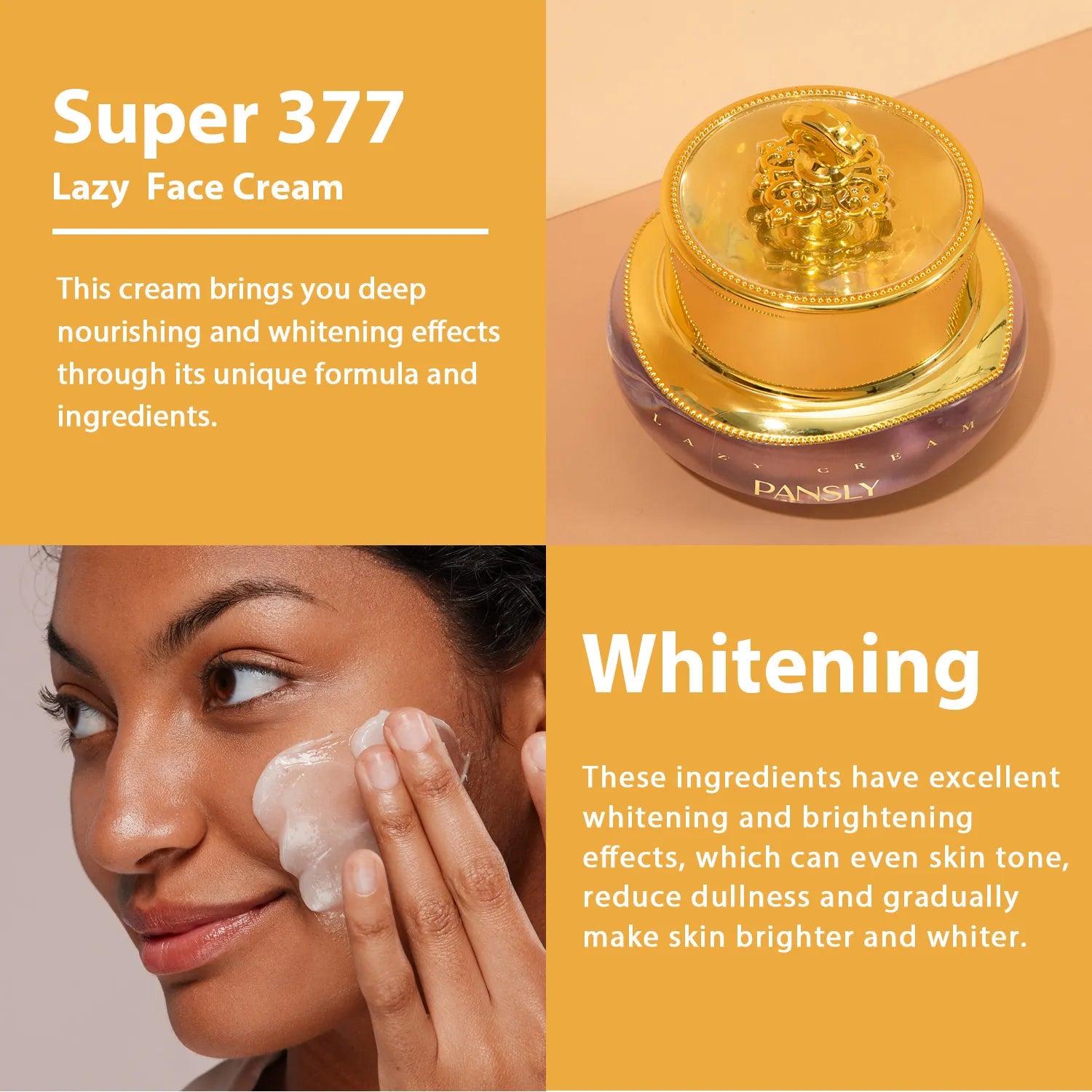 Pansly Dark Spot Remover Brightening Whitening Cream is a powerful skincare solution designed to target dark spots, hyperpigmentation, and uneven skin tone. This brightening cream is formulated with effective ingredients that help lighten dark spots, acne scars, and discoloration, revealing a more radiant and even complexion. Infused with nourishing and skin-loving ingredients, it works to hydrate and protect the skin while providing visible skin tone improvements. Ideal for all skin types, this cream helps restore your skin’s natural glow, leaving it looking fresh, smooth, and luminous.