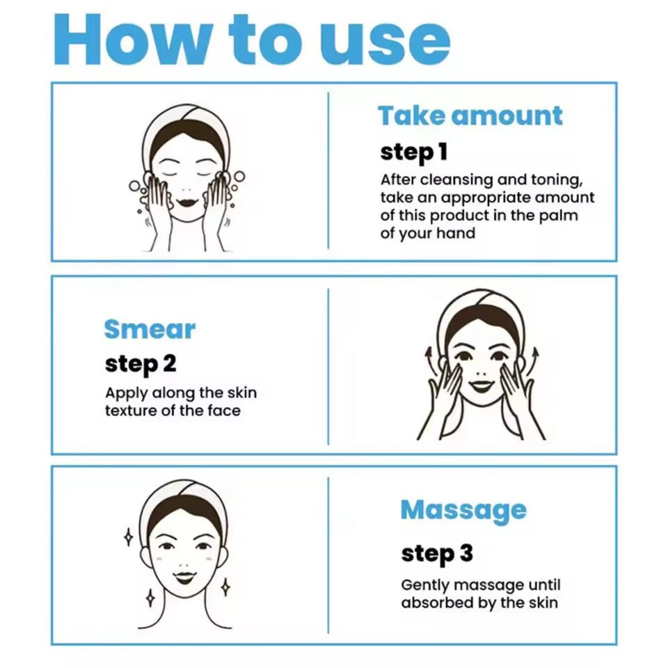 Apply 2–3 drops of serum onto clean, dry skin morning and/or evening. Gently massage or pat over face and neck until fully absorbed. Follow with moisturizer and sunscreen during the day.