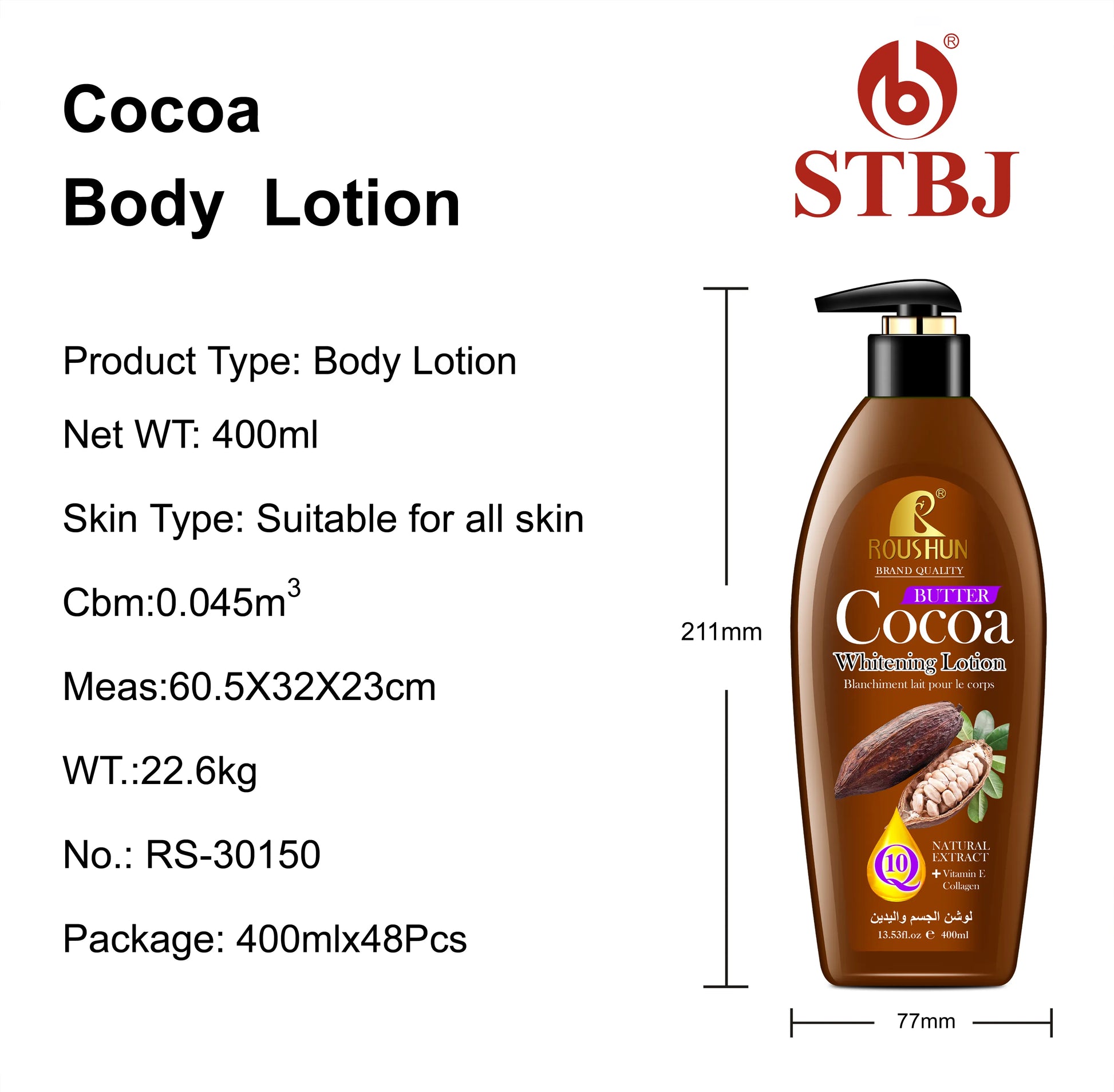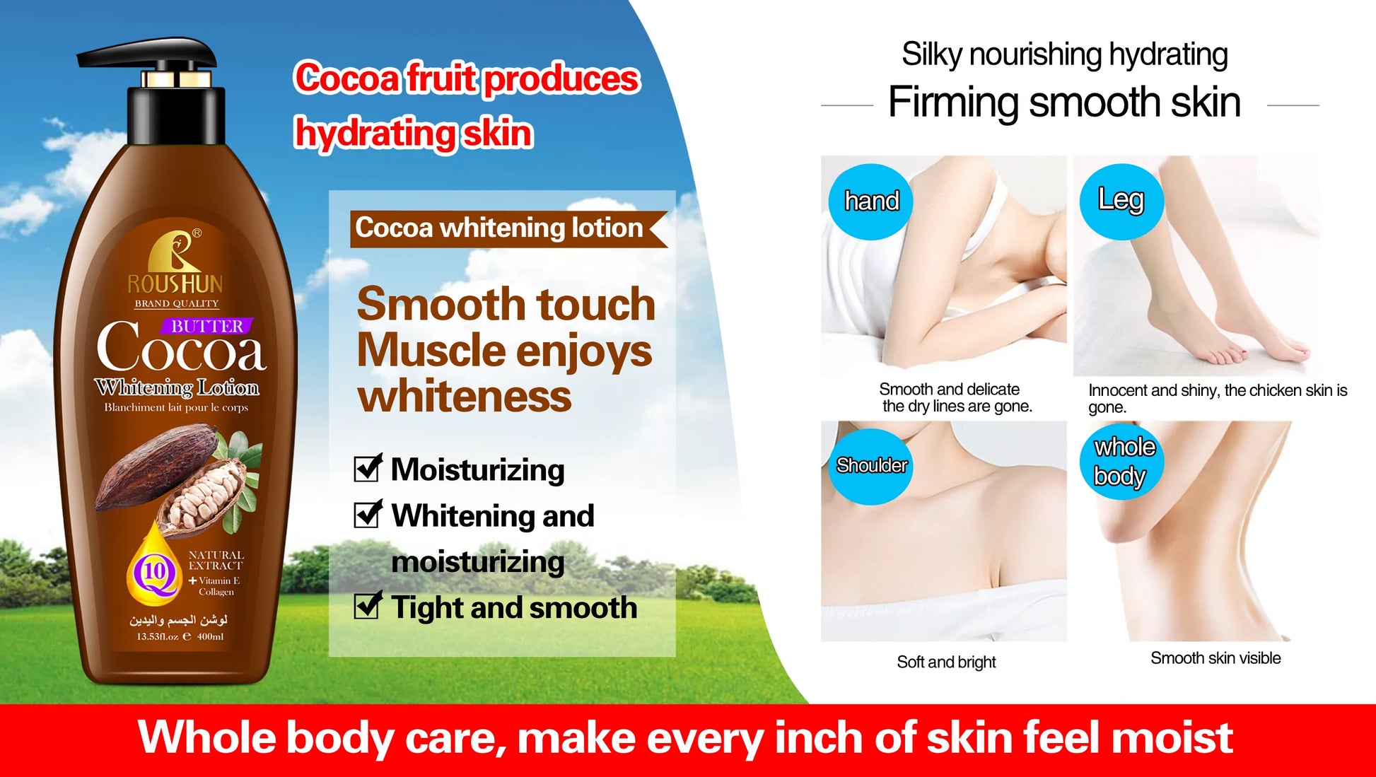 Roushun Cocoa Whitening Lotion is a luxurious skincare product designed to hydrate, nourish, and brighten the skin. Infused with rich cocoa butter, this lotion helps to improve skin tone, reduce dark spots, and give your skin a natural, healthy glow. Its lightweight, non-greasy formula deeply moisturizes while lightening and evening out the skin tone, making it ideal for daily use.