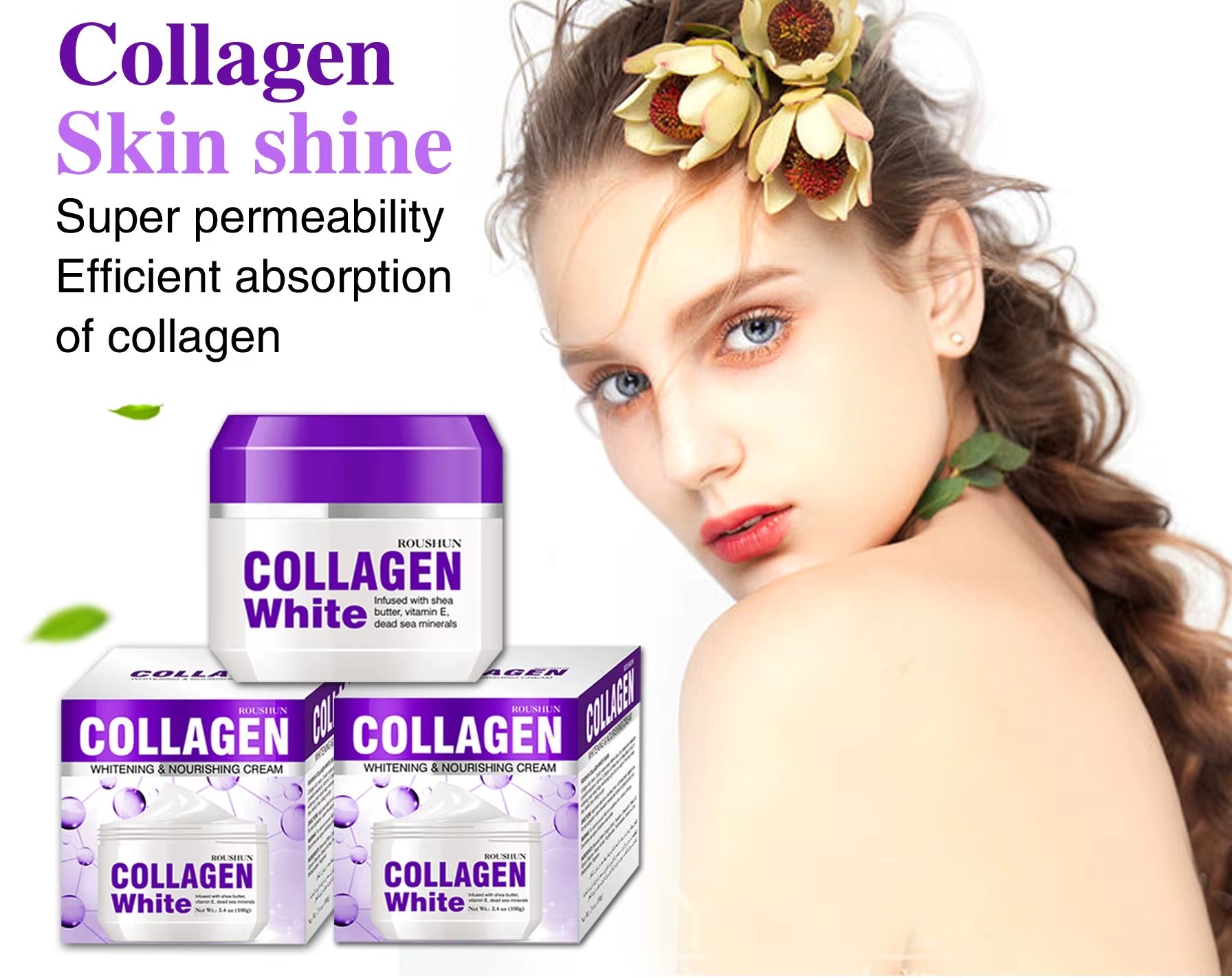 Roushun Collagen White Whitening and Nourishing Cream is a multi-action skincare formula designed to brighten, hydrate, and rejuvenate the skin. Enriched with collagen, whitening agents, and natural nutrients, this cream works to improve skin tone, reduce the appearance of dark spots and blemishes, and restore skin's youthful glow. Its rich, non-greasy texture deeply nourishes the skin while promoting firmness and elasticity.