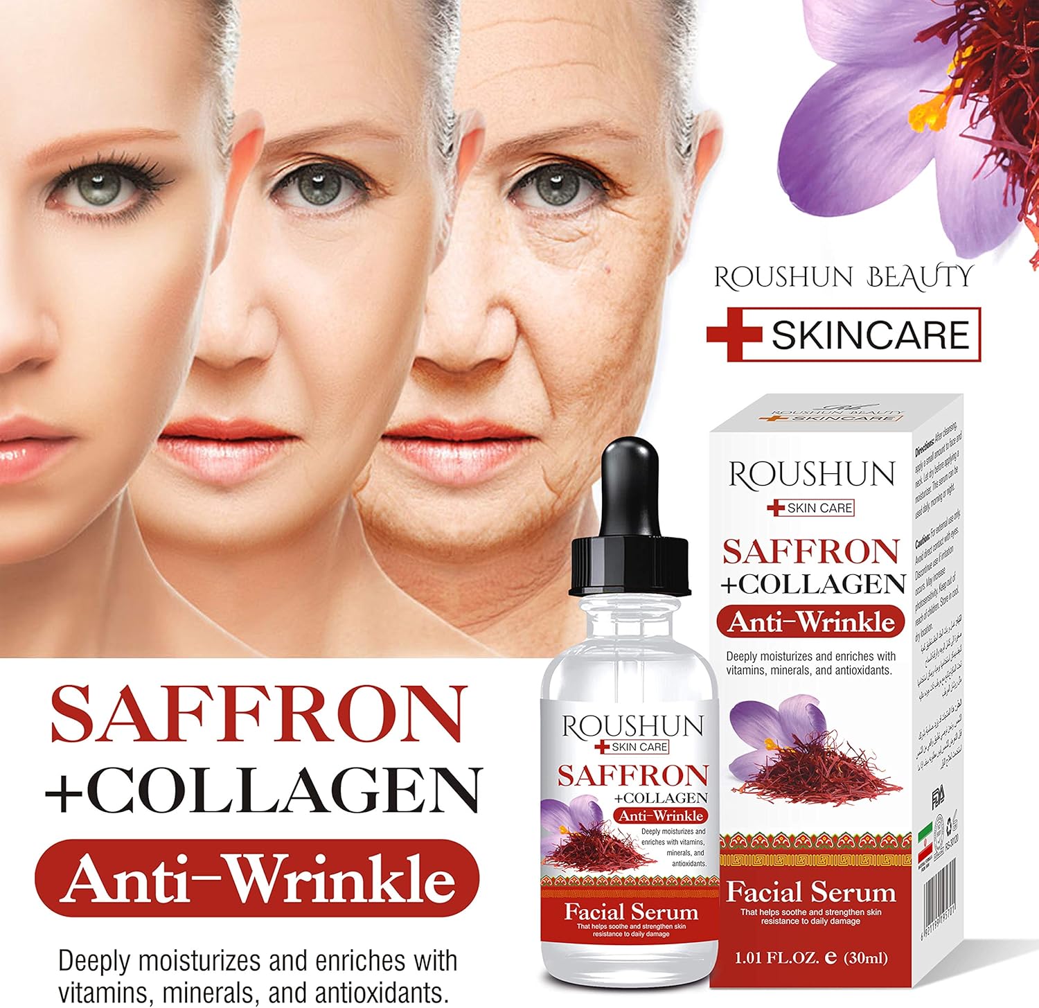 Whether you're looking to combat the effects of aging or simply improve your skin's overall appearance, the Roushun Saffron + Collagen Anti-Wrinkle Facial Serum is a must-have addition to your skincare routine. Enjoy a youthful, glowing complexion with every application!