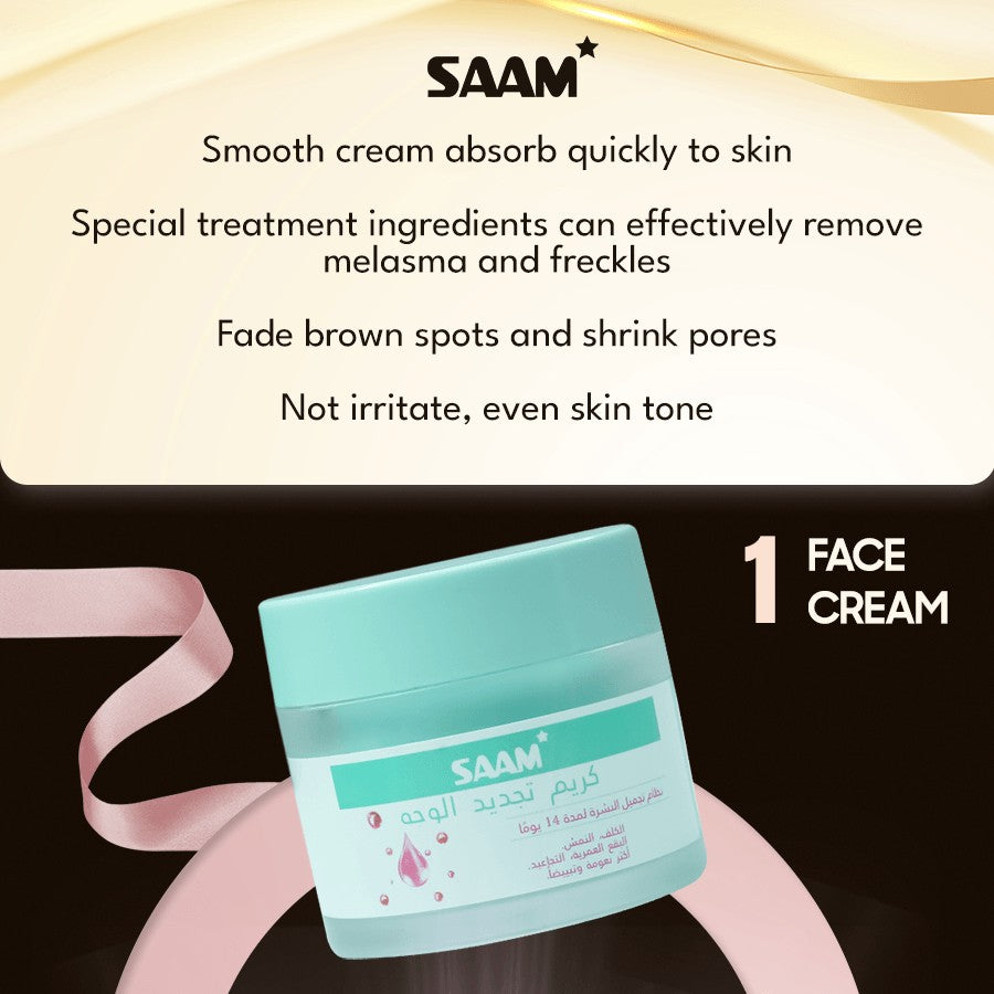 Saam Renewal Face Cream is a premium skincare product designed to revitalize and renew your skin, giving it a refreshed, youthful appearance. Infused with advanced ingredients, this cream targets signs of aging, dryness, and skin fatigue, leaving your face feeling nourished, smooth, and rejuvenated. Its lightweight yet powerful formula works to restore your skin's natural radiance and elasticity, making it ideal for daily use.