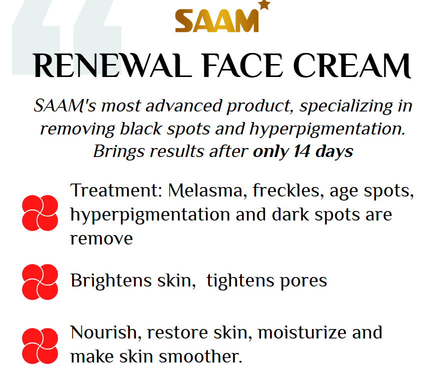 Let me tell you, i used to have a ton of age spots on my face and it was really annoying. After using saam face renewal cream, the spots faded a lot. My skin is glowing white, and pores are negligible. I'm so confident now!