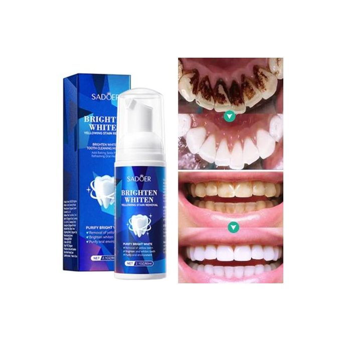 Brighten your smile with SADOER Teeth Whitening Liquid, specially formulated to remove stubborn brown stains and discoloration caused by coffee, tea, smoking, and plaque buildup. This gentle yet effective oral care mousse penetrates deep to dissolve stains, freshen breath, and protect against plaque, leaving your teeth visibly whiter and your mouth feeling refreshed. Safe for daily use, it supports overall dental health while giving you a confident, radiant smile.