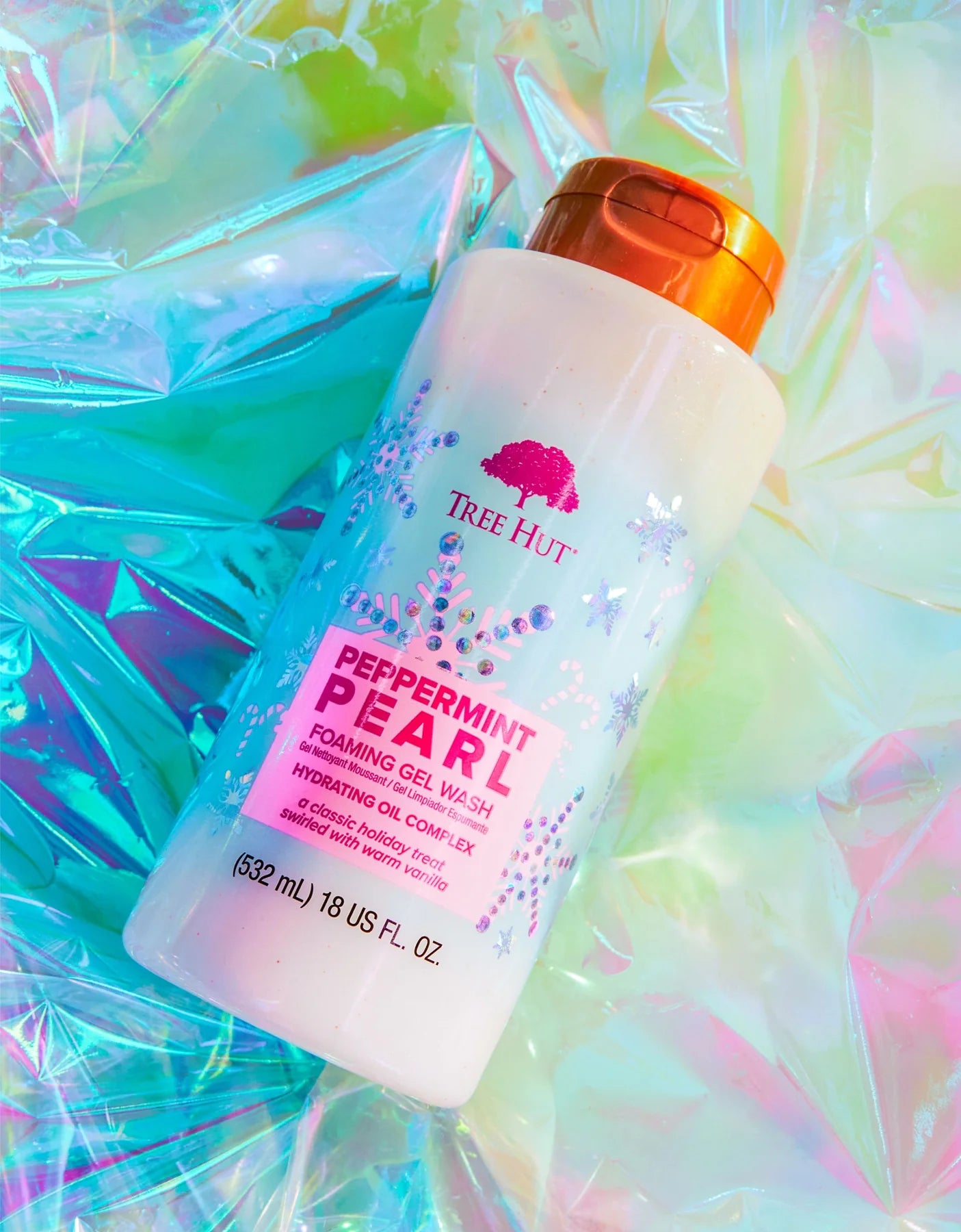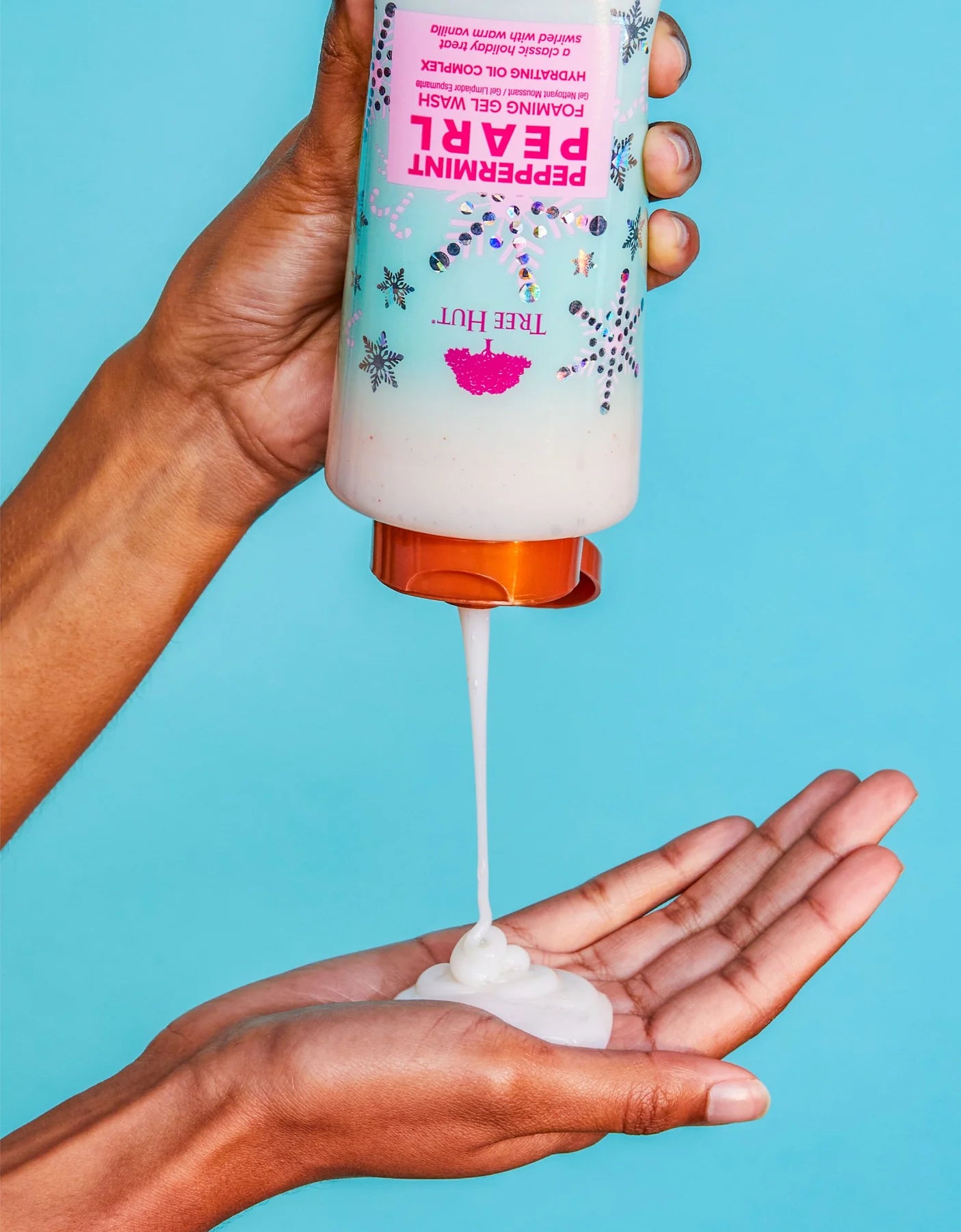 Incorporate Tree Hut Peppermint Pearl Foaming Gel Wash into your holiday skincare routine to enjoy a refreshing cleanse and lasting hydration, leaving your skin feeling rejuvenated and beautifully scented.
