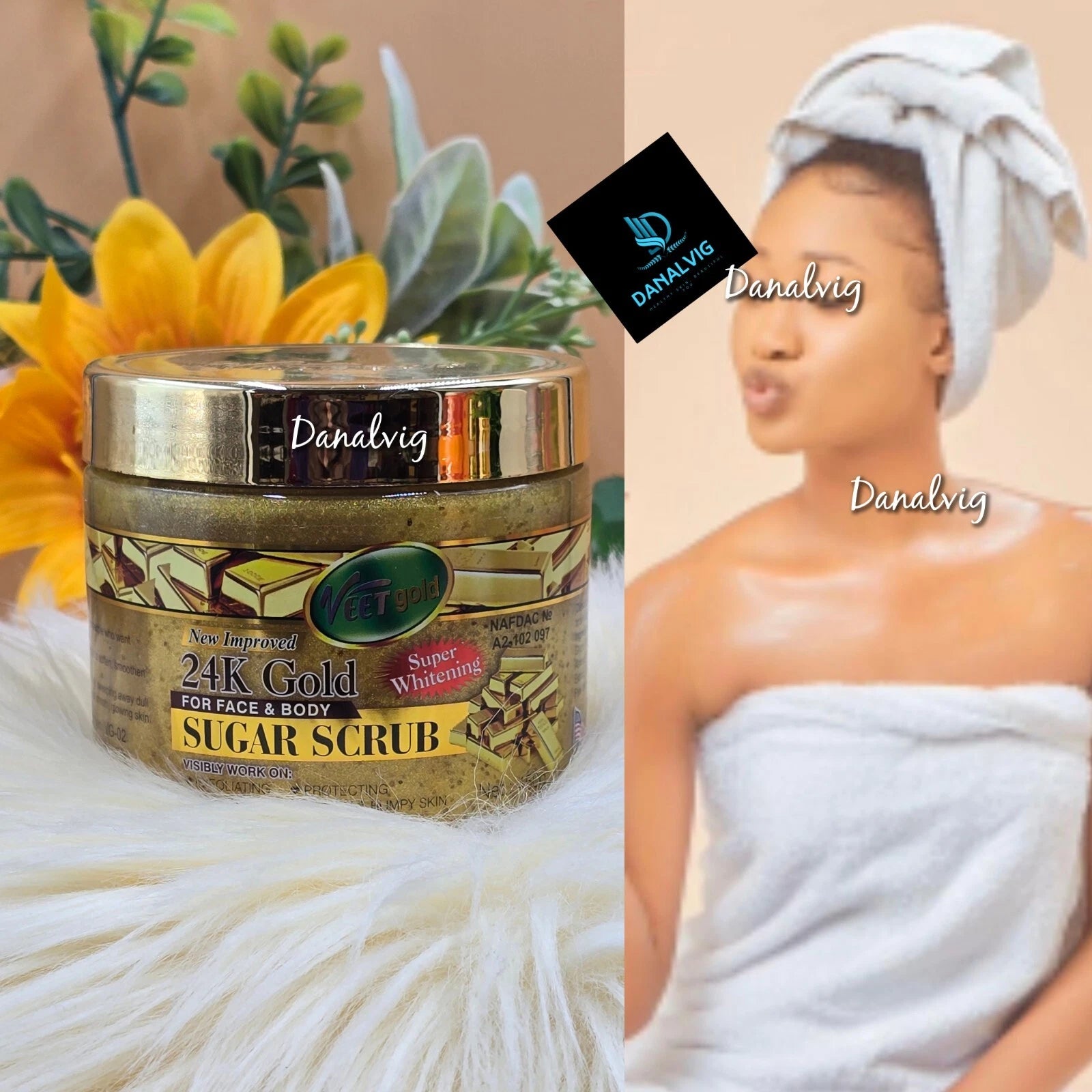 The Veet Gold 24K Gold Super Whitening Face & Body Sugar Scrub (500ml) is a luxurious skincare product designed to exfoliate, brighten, and rejuvenate the skin.