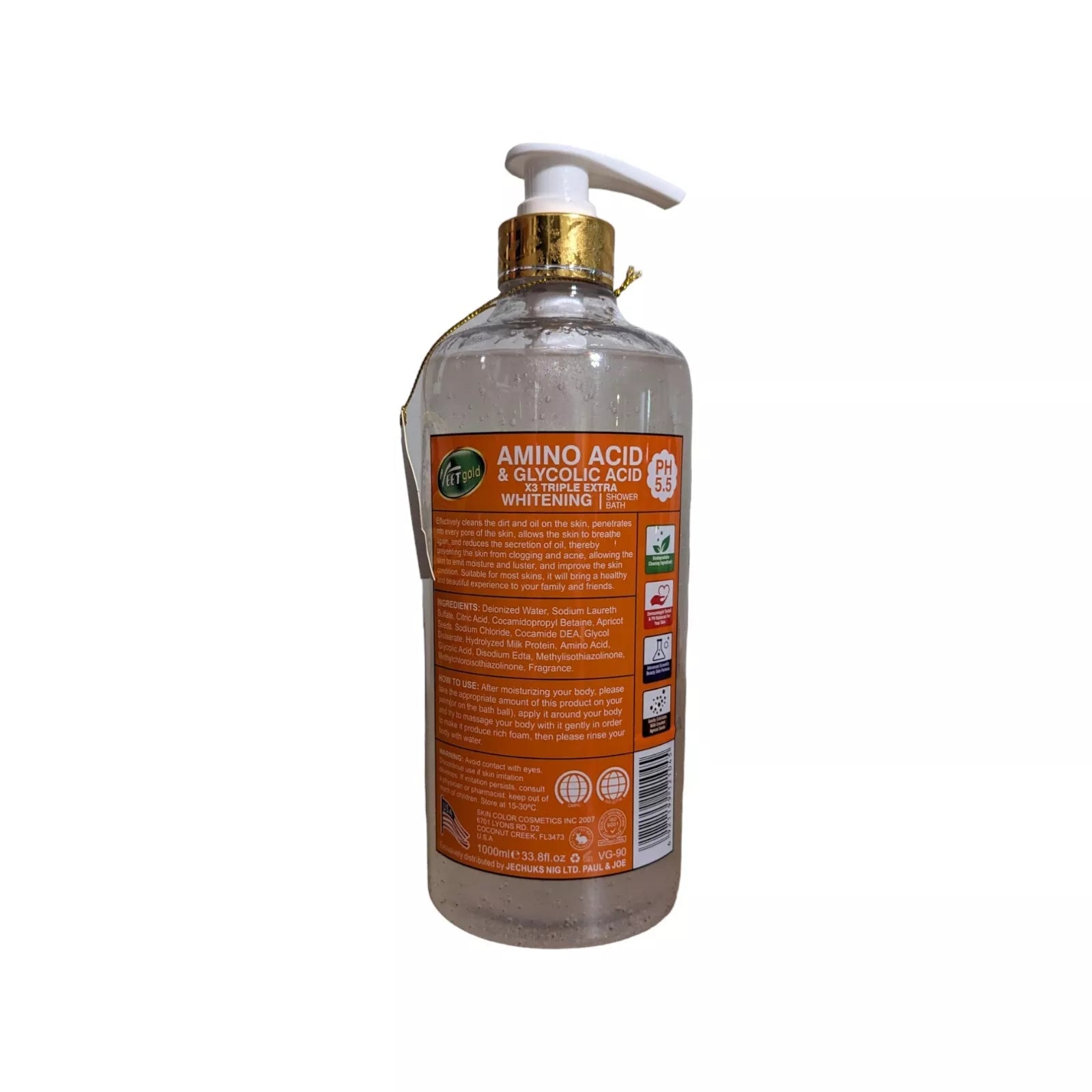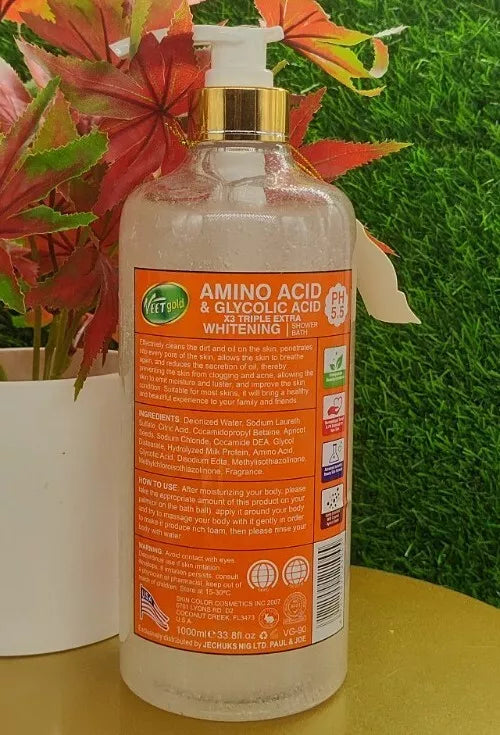 Veet Gold Amino Acid & Glycolic Acid Whitening Shower Bath Gel is a luxurious body wash designed to cleanse, exfoliate, and brighten your skin. Infused with amino acids and glycolic acid, this shower gel gently removes dead skin cells, unclogs pores, and promotes a smoother, more radiant complexion. Enriched with SPF 30, it provides sun protection, shielding your skin from harmful UV rays.