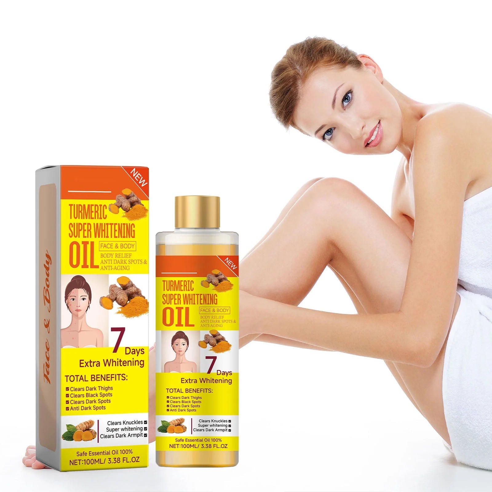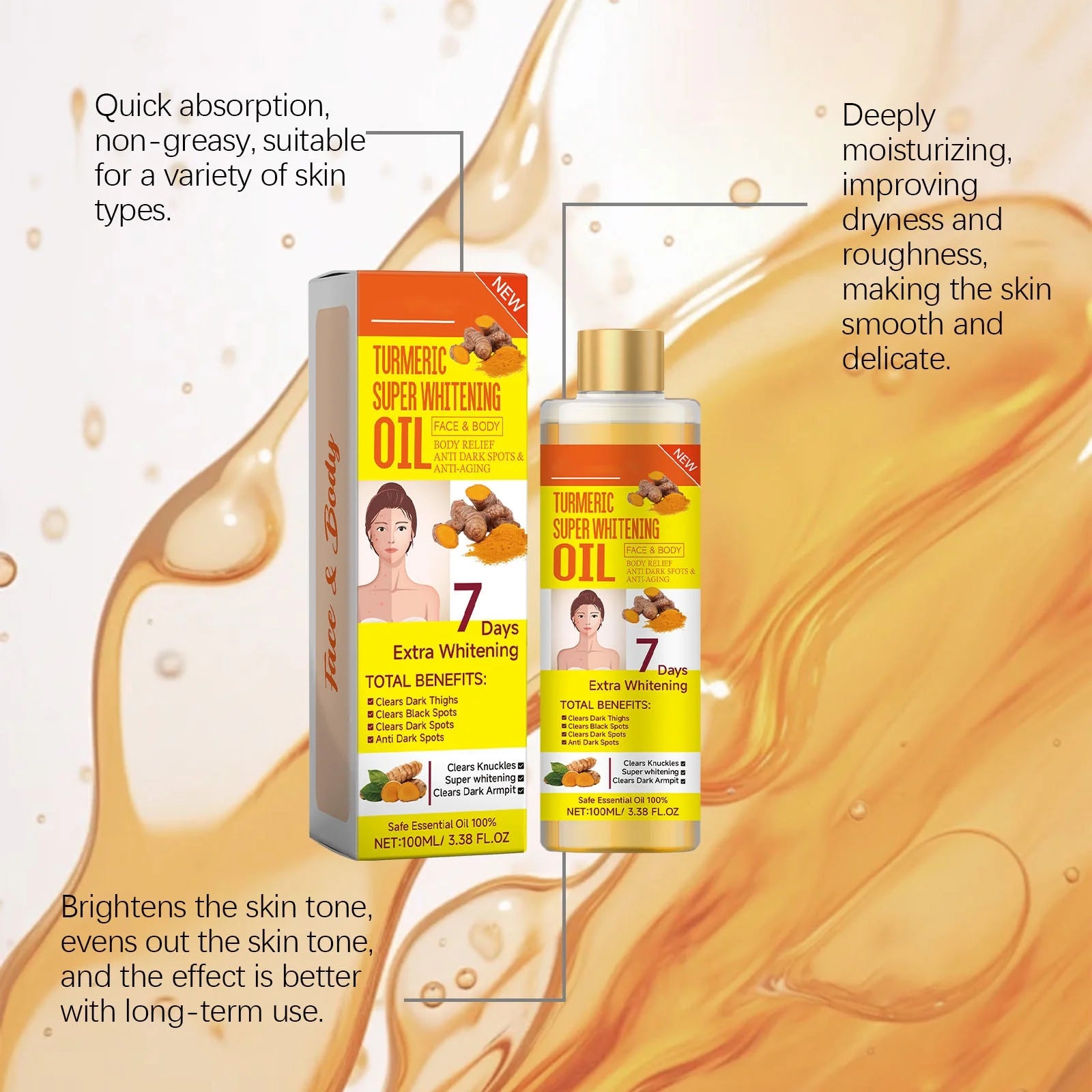 Veetgold Turmeric Super Whitening Body Oil is a luxurious skincare oil designed to brighten, even out skin tone, and provide deep nourishment. Enriched with the natural power of turmeric, this body oil helps reduce dark spots, pigmentation, and uneven skin tone, leaving your skin glowing and radiant. Its lightweight, fast-absorbing formula deeply moisturizes, softens, and smooths the skin, giving you a silky, smooth finish.
